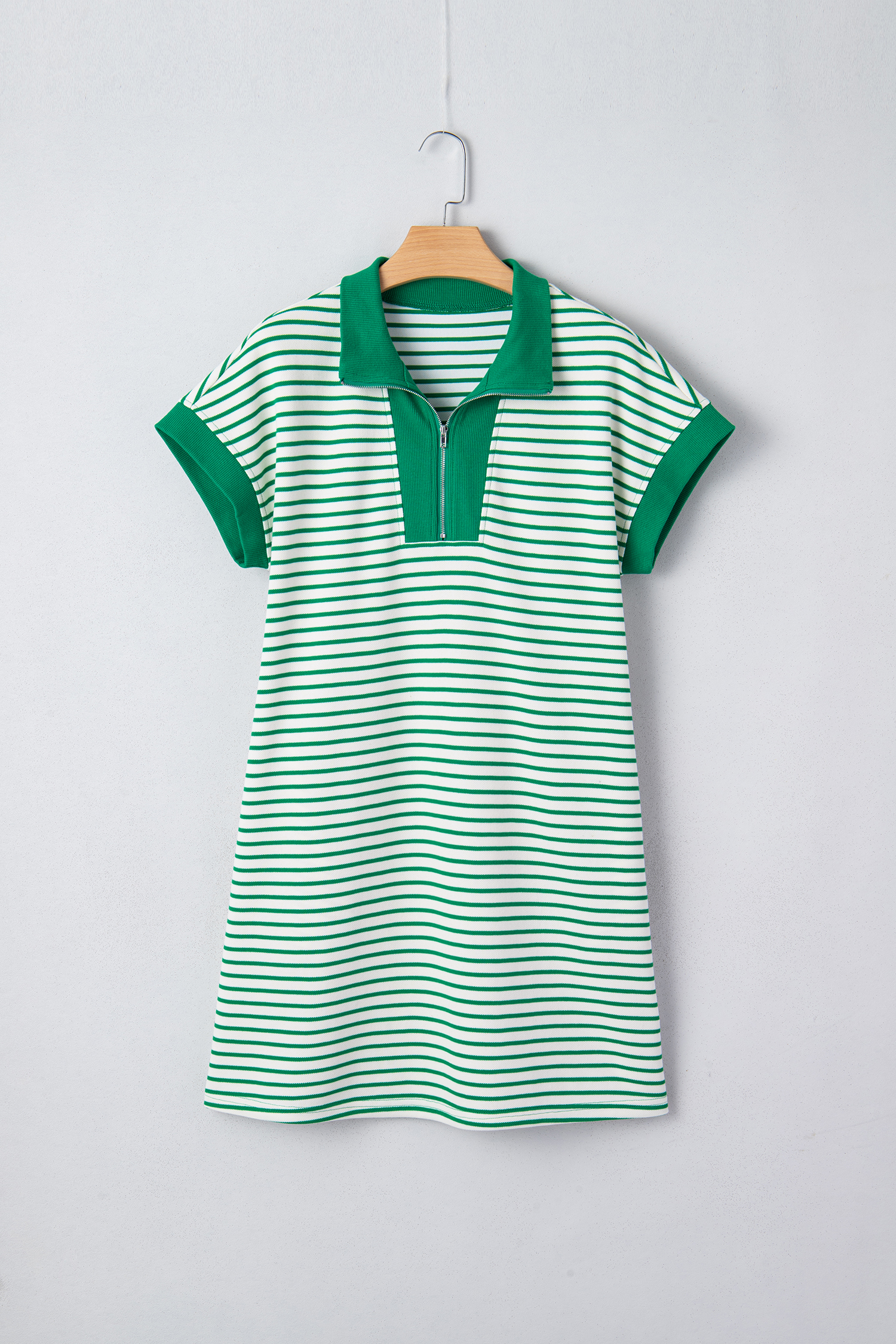 Green Stripe Quarter Zip Polo Collar T Shirt Dress with Pockets