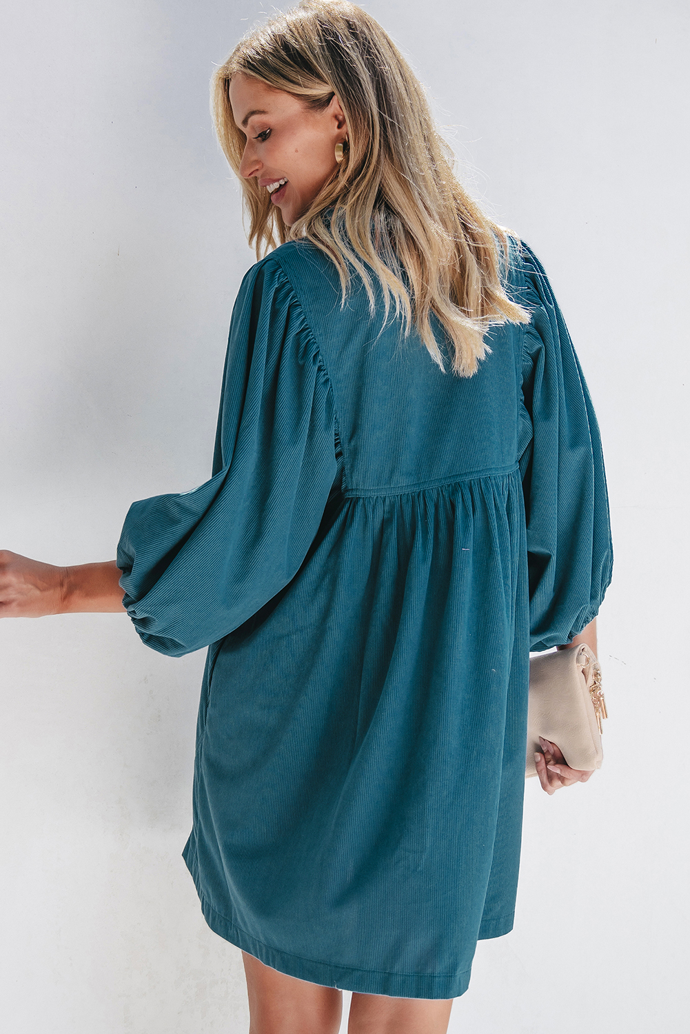 Vineyard Green Corduroy Snap Buttons Empire Waist Bracelet Sleeve Dress